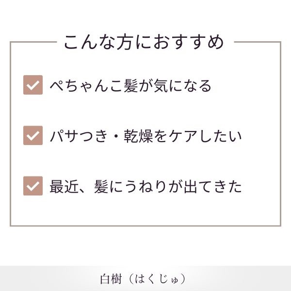 水、DPG、オクチルドデカノール、セテアリルアルコール、パンテノール、ハチミツ、ヒアルロン酸Na、加水分解ダイズタンパク、加水分解ケラチン、オリーブ油、ヒマワリ種子油、月見草油、ツバキ油、ブドウ種子油、タウリン、リシンHCl、グルタミン酸、グリシン、ロイシン、ヒスチジンHCl、セリン、バリン、アスパラギン酸Na、トレオニン、アラニン、イソロイシン、アラントイン、フェニルアラニン、アルギニン、プロリン、チロシン、イノシン酸2Na、グアニル酸2Na、ローズマリーエキス、ハイビスカス花エキス、キハダ樹皮エキス、イランイラン油、パチュリ油、グレープフルーツ果皮油、ゼラニウム油、ビャクダン油、BG、クエン酸、カラメル、ステアルトリモニウムクロリド、ステアルトリモニウムブロミド、ステアリン酸グリセリル、イソプロパノール、安息香酸Na、香料(植物由来精油)